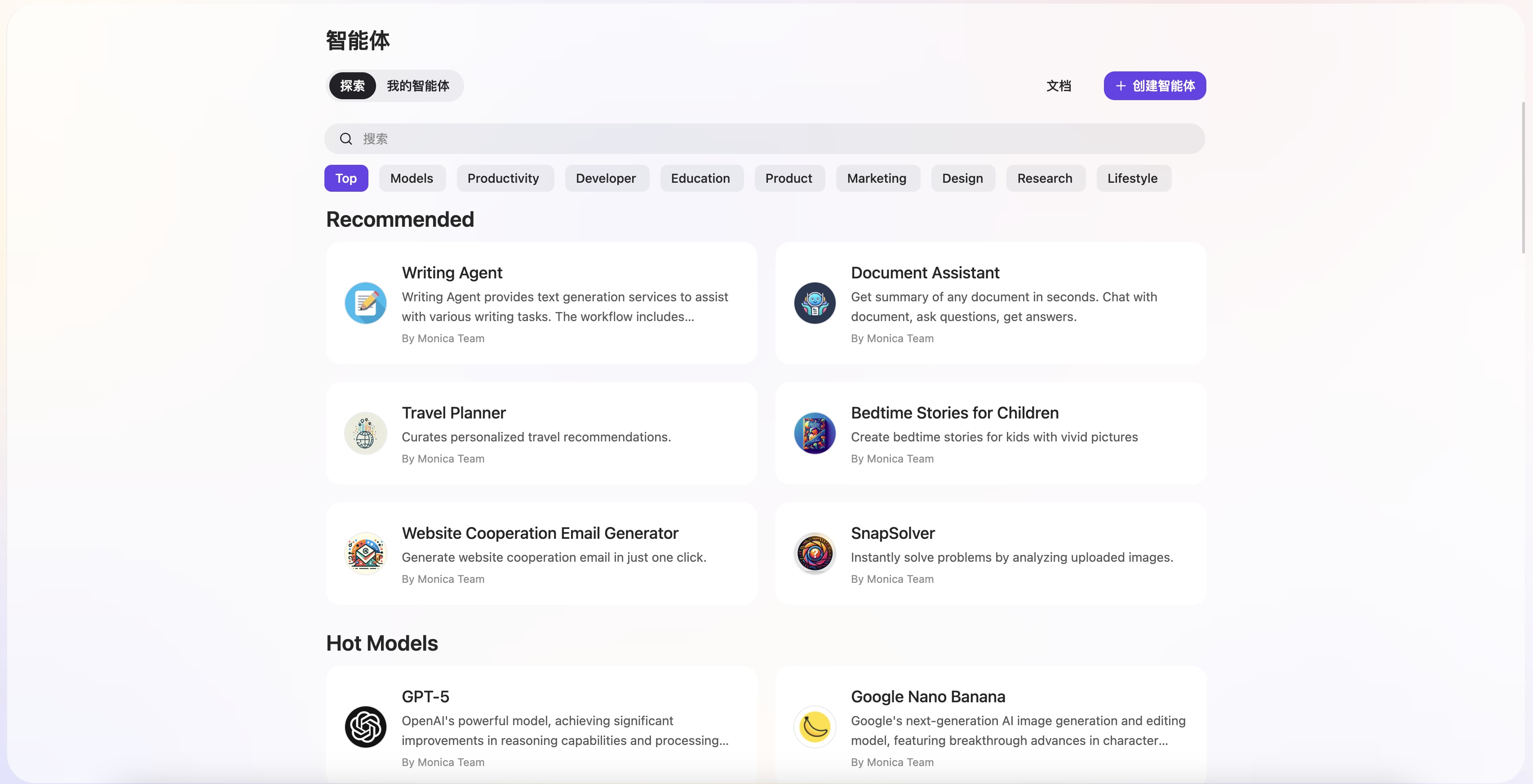 Monica Bots是是一款基于先进 ai 模型(如 GPT-4、Claude、Gemini 等)的多功能 AI 助手,能助力用户快速创建和部署智能助手(Bots)的平台,Monica Bots支持跨平台使用,包括浏览器插件(Chrome、Edge、Safari)、桌面端(Windows、macOS)和移动端(iOS、Android)。它集成了、写作、翻译、数据分析、AI 绘图等多项功能,让即使没有技术背景的人也能轻松上手构建和管理自己的AI应用。