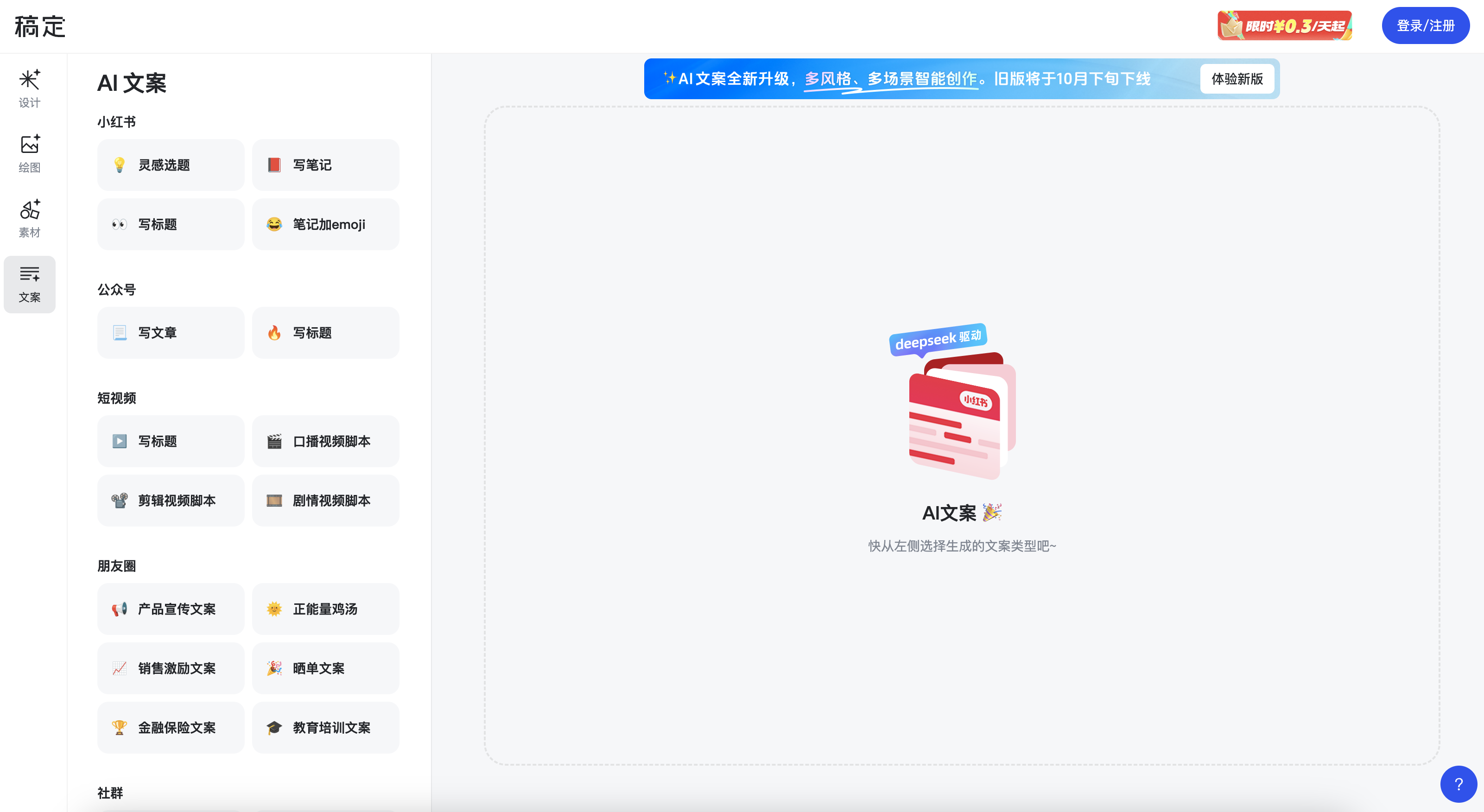稿定设计是一个强大的在线图形设计和内容创作平台,而其AI文案生成工具是该平台的核心功能之一。它不仅仅是一个独立的文案工具,更是一个将AI智能写作与海量设计模板深度融合的一站式解决方案。
