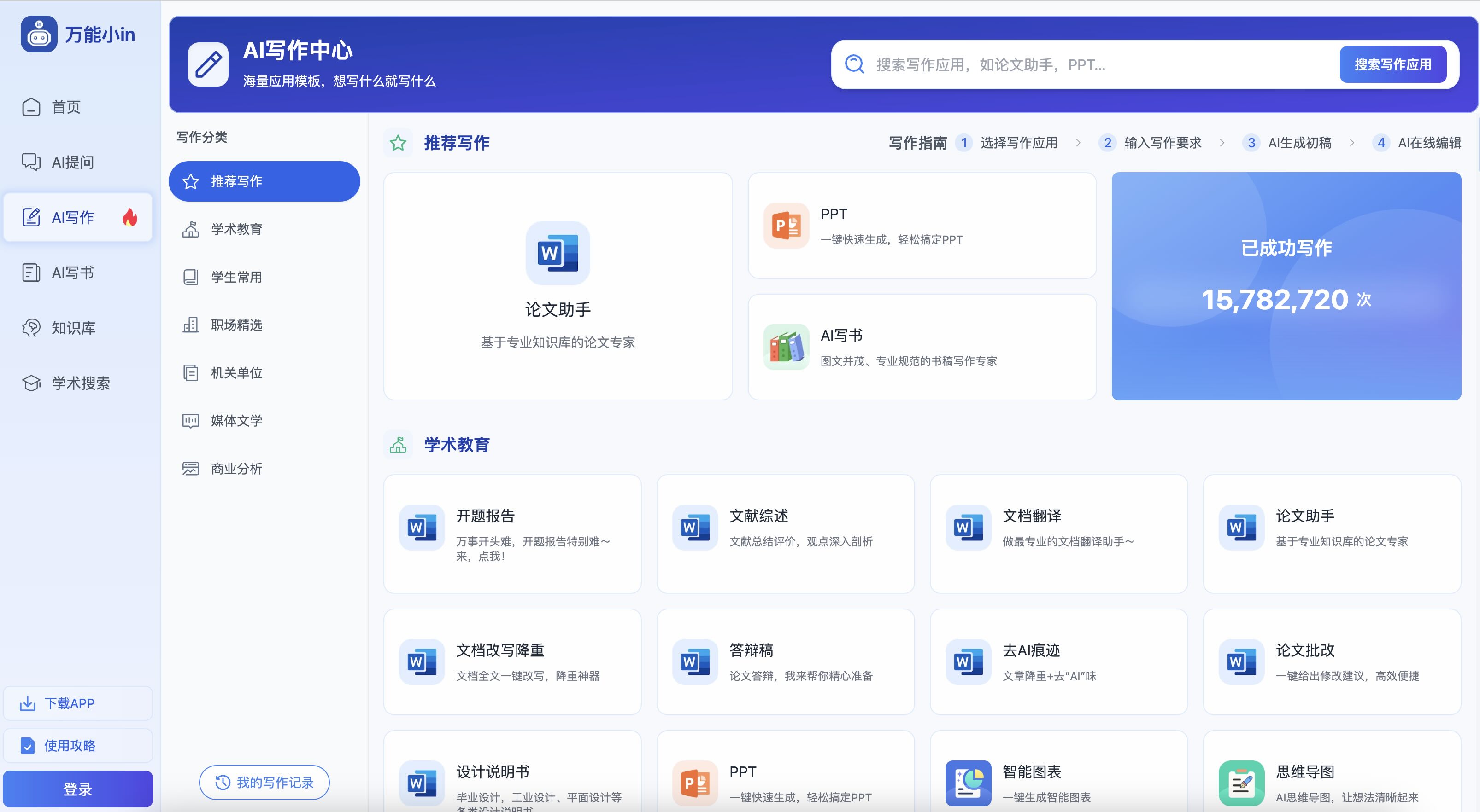 总结:万能小in作为专业的AI写作专家平台,以其全面的场景覆盖、专业的写作质量和便捷的操作体验,成为学术研究、职场办公和内容创作的得力助手。