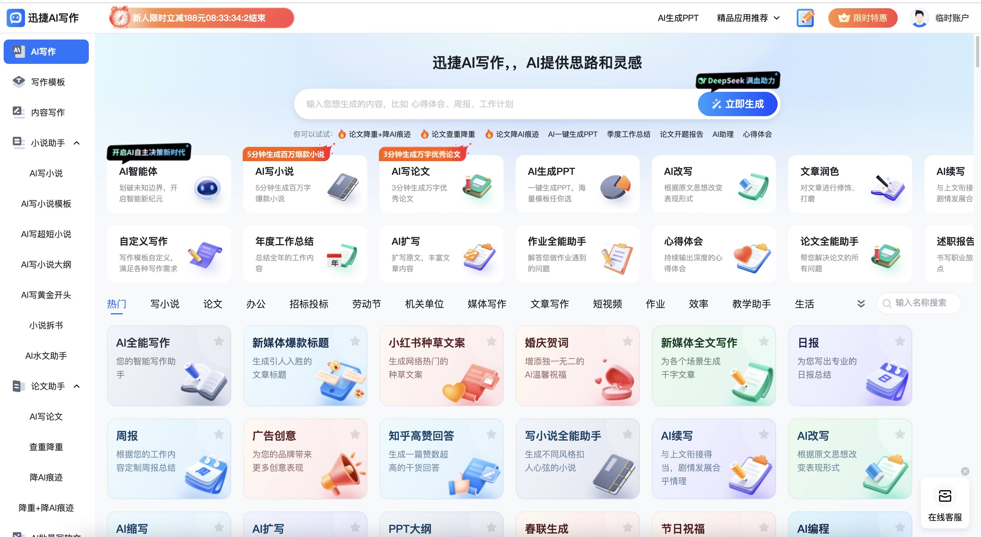 迅捷智能创作平台作为一个综合性的文档创作辅助工具,通过其丰富的功能模块和智能化的服务支持,为用户提供了全方位的写作解决方案。平台不仅注重实用性和效率提升,更在专业性方面表现出色,能够满足不同用户的多样化需求,是现代办公和学习场景中的得力助手。